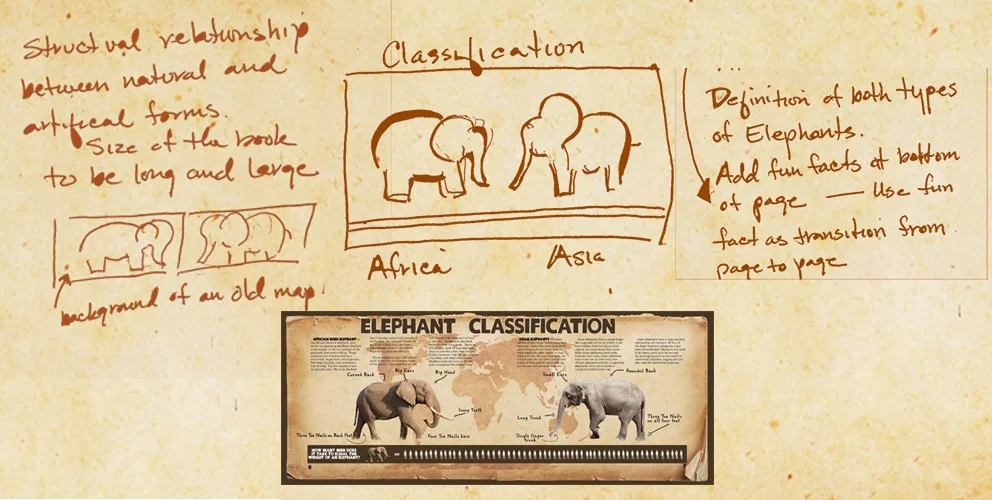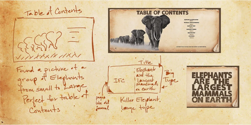 Three different fonts were chosen for the book. The title font is large and bold like the Elephant. The name of the font is “Killer Elephant.” The font is used in the book for my main title and subtitle type. The body type I chose is a font called “Folio", which has a similar structure of an Elephant. It is a clean simple san serf typeface. The body of the font is big and wide like an Elephant. I think it works well with “Killer Elephant” and is a good match. The other font I used was a handwritten style font called “Regular Joe”. I used it to create that big adventure, old handwritten journal feel to the book.